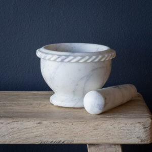 This white marble mortar and pestle is the sort of piece that belongs right on the kitchen bench, not tucked away in a cupboard. It’s solid and weighty in the hand (as it should be), cool to the touch, and makes quick work of herbs, spices, and garlic. I use mine constantly — grinding peppercorns, muddling basil, or smashing a few cloves with a sprinkle of flaky salt before Sunday roast.