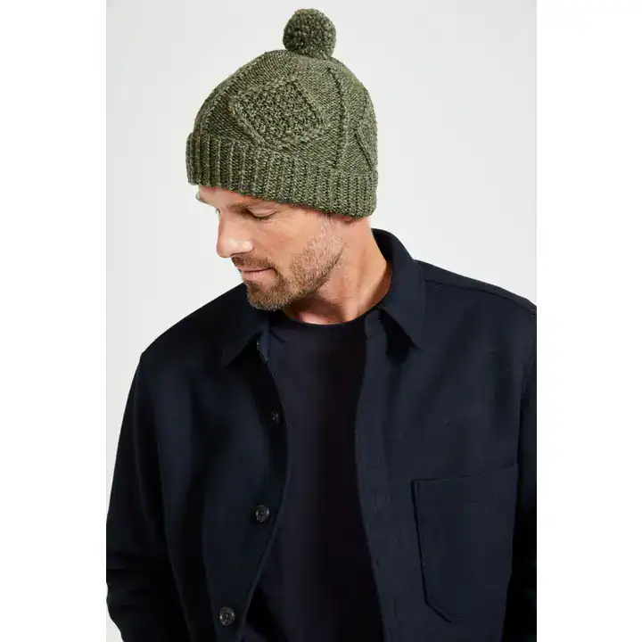 Part of the Kinard diamond stitch range, this beanie features a beautiful Aran diamond stitch filled with moss stitch, between corded and rope cables. As well as this, an expertly crafted Aran pom pom adorns the top for added texture and Aran flair.