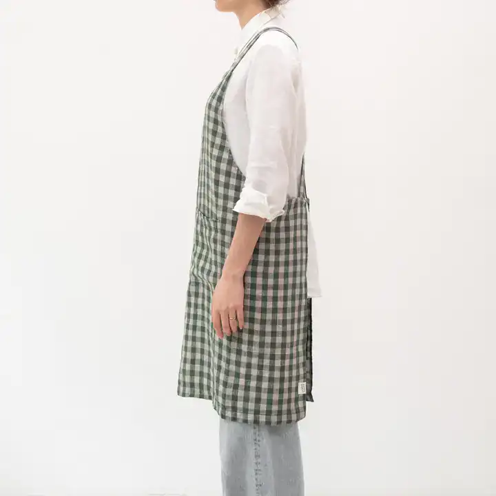 Linen Tales Forest Green Gingham Linen Japanese Crossback Apron